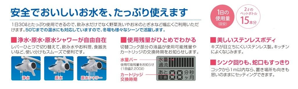 水本来のピュアなおいしさはそのままに。好評の流量計が切替コック側について見やすくなり、キッチンに美しくとけ込むスタイリッシュなデザインに一新しました。